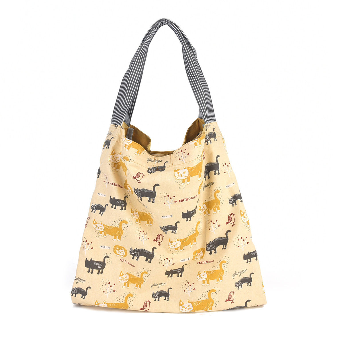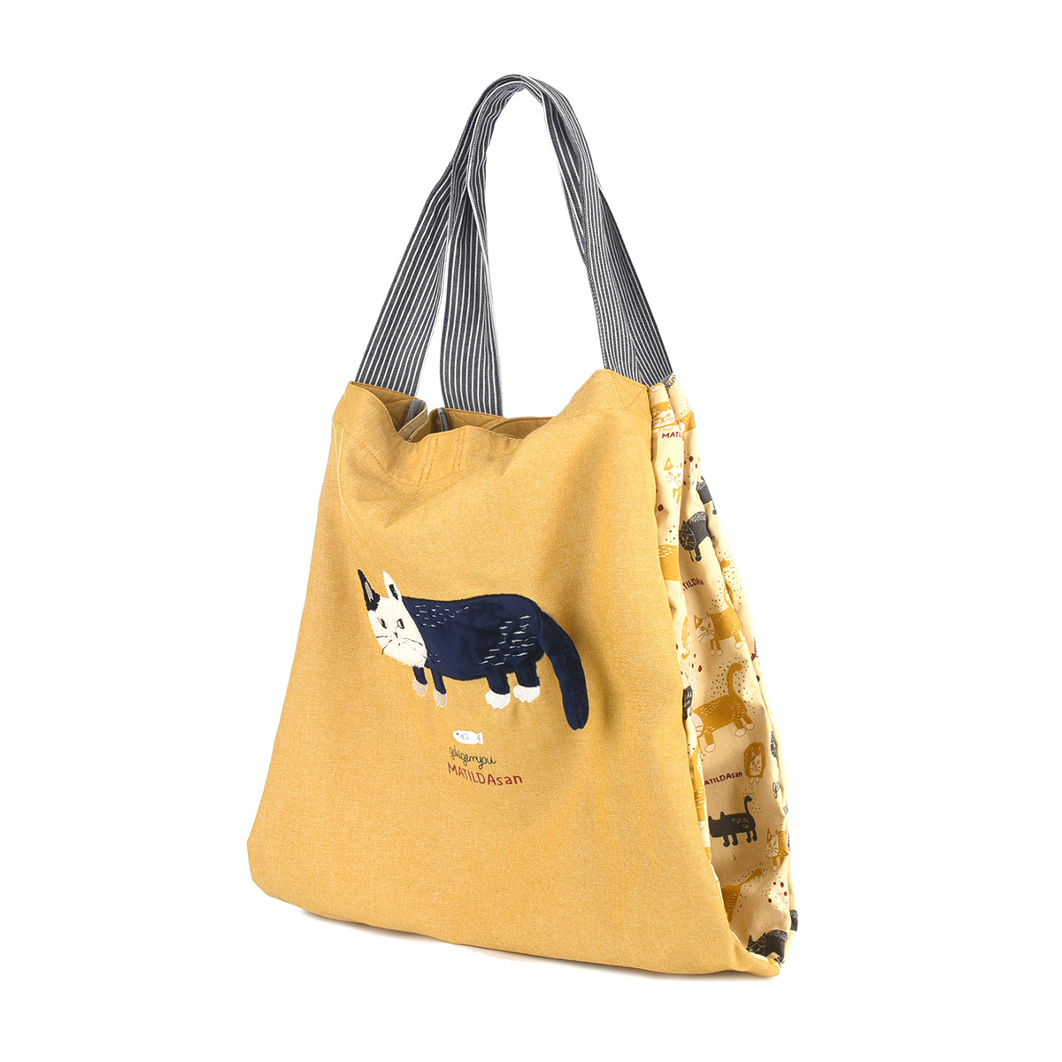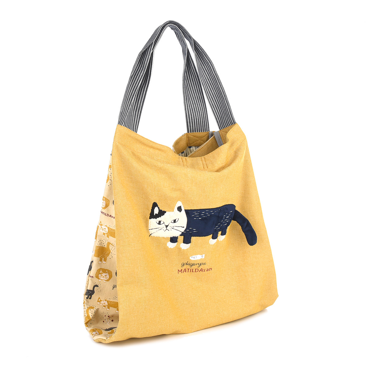 На передней части сумки красуется дизайнерская нашивка из 100% хлопка с изображением кошки Матильды из коллекции «MATILDASan». Этот яркий элемент сразу привлекает внимание. Задняя часть сумки украшена сплошным принтом с изображением этой милой кошки.
