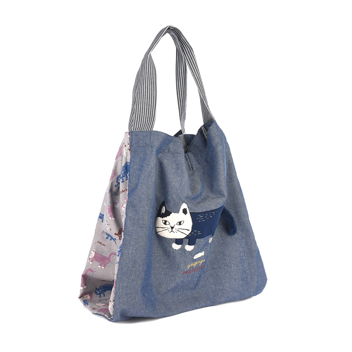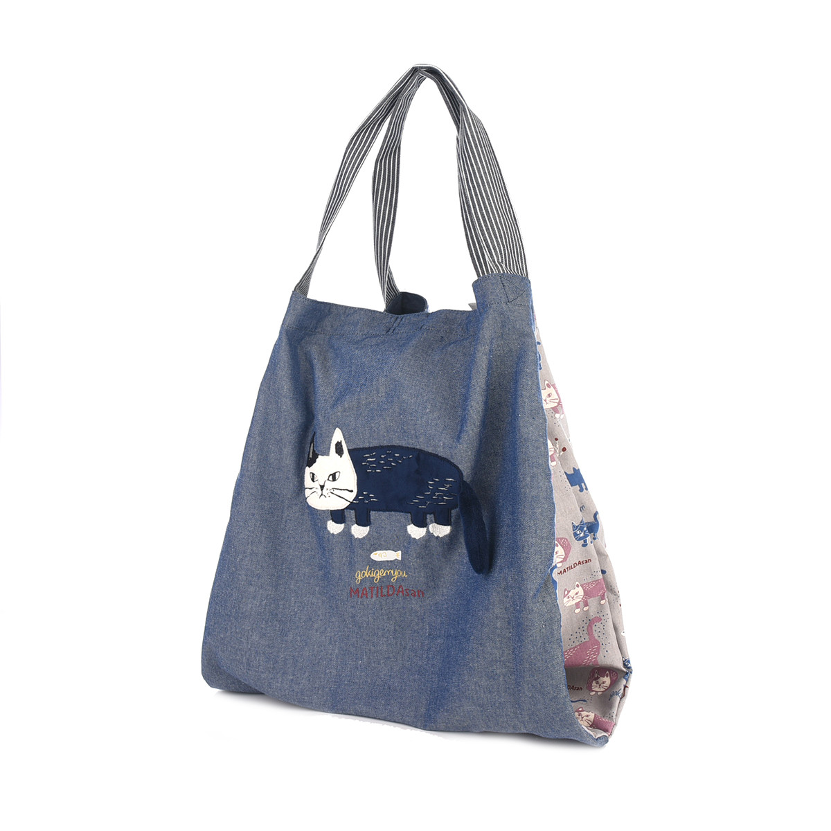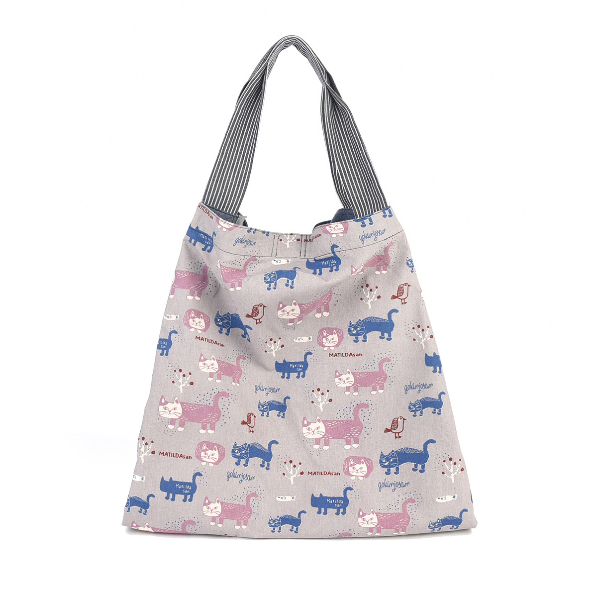На передней части сумки красуется дизайнерская нашивка из 100% хлопка с изображением кошки Матильды из коллекции «MATILDASan». Этот яркий элемент сразу привлекает внимание. Задняя часть сумки украшена сплошным принтом с изображением этой милой кошки.